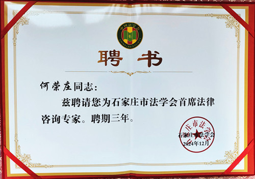 2024年12月20日,我所主任何荣庄律师受聘为石家庄市法学会首席法律咨询专家。