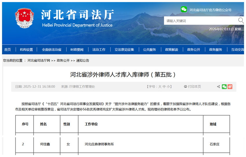 近日,河北省司法厅为加强全省涉外律师人才队伍建设,优化涉外法律服务资源配置,正式公布了增补56名优秀律师充实扩大全省涉外律师人才库的名单。河北庄鼎律师事务所何佳鑫律师凭借扎实的法律专业功底、丰富的涉外案件处理经验及良好的职业素养,成功入选河北省涉外律师人才库,成为我省涉外法律服务领域的骨干力量之一。